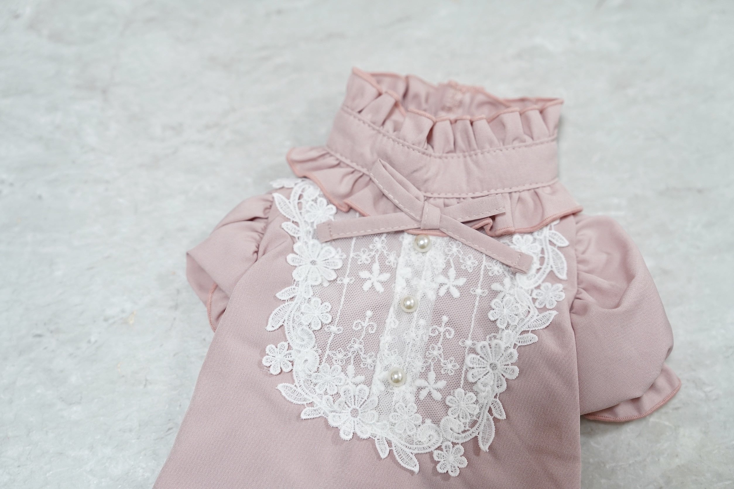 立ち襟や胸元のフリルが